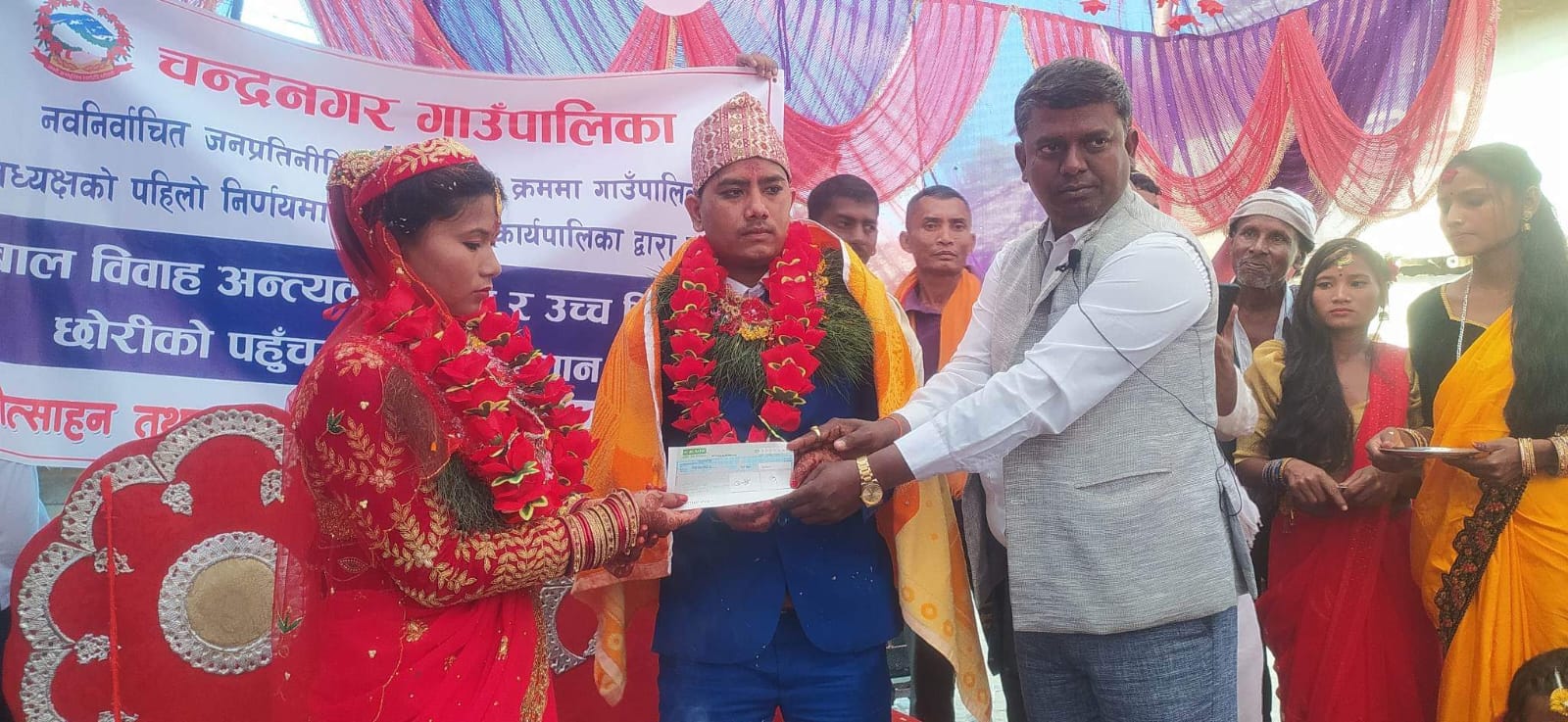 चन्द्रनगर गाउँपालिका वार्ड न.२ दनुवार टोल निवासी हरदेव कुँवरको २२ बर्षिय छोरी रेनु कुमारी सिंहलाई गाउँपालिका अध्यक्ष राजकुमार महतोले विवाह मण्डपमै गएर ५० हजार बराबरको पहिलो चेक हस्तानान्तरण गरेका हुन ।