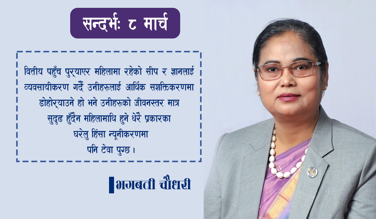 ग्रामीण क्षेत्र, दलित, अल्पसंख्यक, मुसहर जस्ता विपन्न समुदायका महिलाहरूसँग आर्थिक पहुँच शून्य छ । परिवारमा पुरुषले कमाउने महिलाले घरधन्धा मात्र गर्ने सोच हावी हुँदा पुरुषले जे दियो त्यसमै जीवन निर्वाह गर्नु उनीहरूको बाध्यता छ । यस्ता समुदायमा वित्तीय पहुँच पुर्याएर महिलामा रहेको सीप र ज्ञानलाई व्यवसायिकरण गर्दै उनीहरूलाई आर्थिक सशक्तिकरणमा डोहोर्याउने हो भने उनीहरूको जीवनस्तर मात्र सुदृढ हुँदैन महिलामाथि हुने धेरै प्रकारका घरेलु हिंसा न्यूनीकरणमा पनि टेवा पुग्छ ।