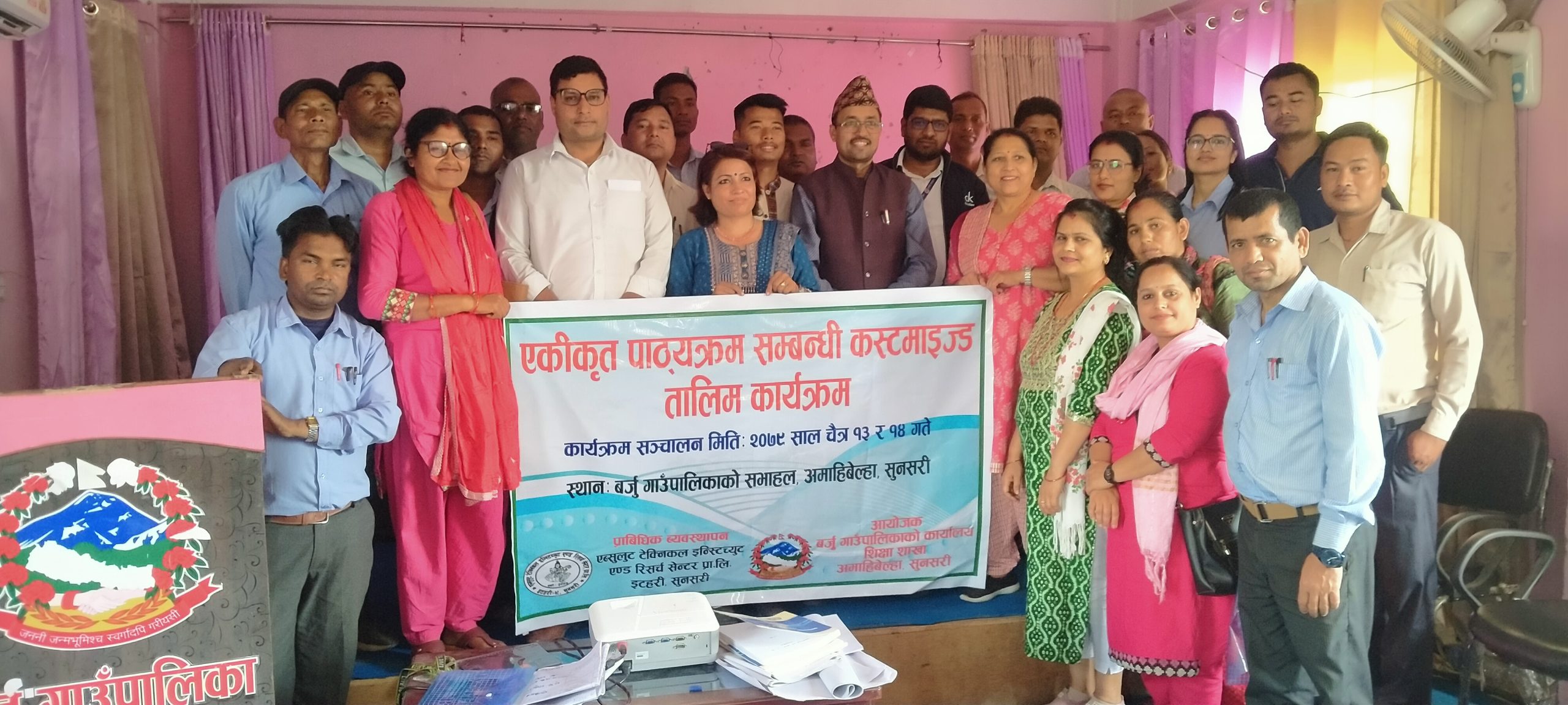 विराटनगर। बर्जु गाउँ पालिकाको एकीकृत पाठ्यक्रम सम्बन्धि कस्स्ट्माइज्ड तालिम आज सम्पन्न भएको छ । गाउँ पालिकाको शभाहलमा भएको दुई दिने तालिम समापन भएको हो । यो कार्यक्रमको प्राविधिक व्यवस्थापनमा एब्सुलुट टेक्निकल ईन्स्टिच्यु एण्ड रिसर्च सेन्टर प्रा.लि. इटहरी को सहयोग थियो भने आयोजकमा बर्जु गाउँ पालिकाको कार्यालय, शिक्षा शाखा अमाहिबेल्हा, सुनसरी रहेको थियो । कार्यक्रमको उद्घाटन गाउँ पालिकाको उपाध्यक्ष श्रीमति नितु कुमारी चौधरीले गर्नु भएको थियो ।
