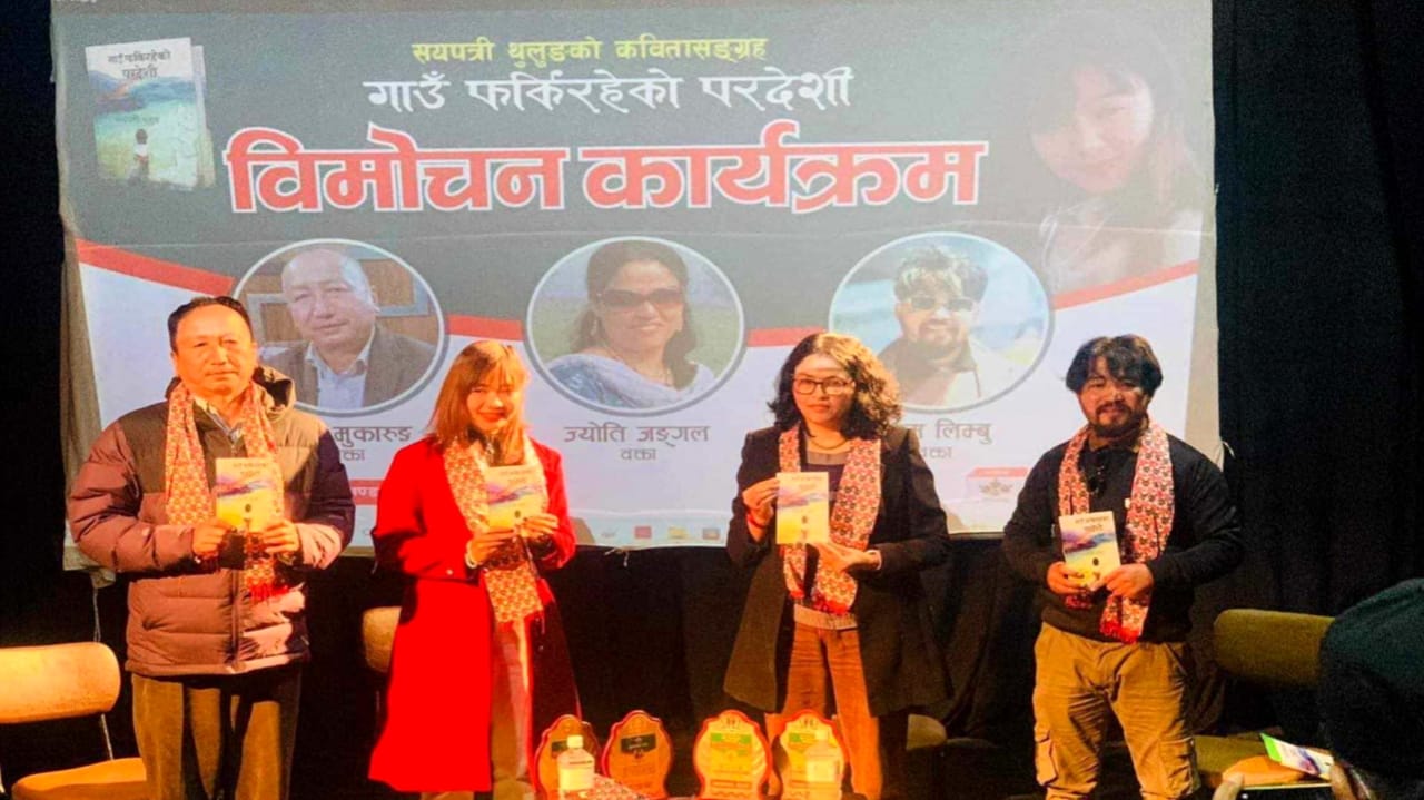 काठमाण्डौं । कवि सयपत्री थुलुङ्क कविता कृति ‘गाउँ फर्किरहेको परदेशी’को काठमाडौमा लोकार्पण सम्पन्न भएको छ । सम्भव समूहको आयोजनामा मण्डला थिएटरमा कार्यक्रम साहित्यकार कवि सयपत्री थुलुङ्क सम्पन्न भएको हो ।