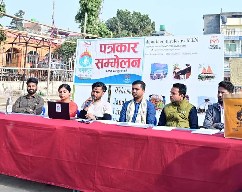 जनकपुरधामस्थित जानकी मन्दिर प्राङ्गनमा निरन्तरत चार वर्ष जनकपुर साहित्य महोत्सव सफलता पुर्वक सम्पन्न गर्दै पाँचौ संस्करणको साहित्य महोत्सवको आयोजना गरेको मंगलबार पत्रकार सम्मेलन गरि आयोजकले जानकारी दिए। नव मिथिला फाउन्डेखको आयोजनामा प्रत्येक वर्षको फागुनमा हुने साहित्य महोत्सव यसपटक पनि फागुनको १०,११ र १२ गते गरि तीन दिवसिय हुनेछ। विगत चार वर्षदेखि जनकपुरधामस्थित जानकी मन्दिर प्राङ्गनमा भइरहेको महोत्सव केही प्राविधिक कारण यस पटक राम मन्दिरको प्राङ्गनमा हुने नव मिथिला फाउन्डेसनका अध्यक्ष अमित साहले बताए।