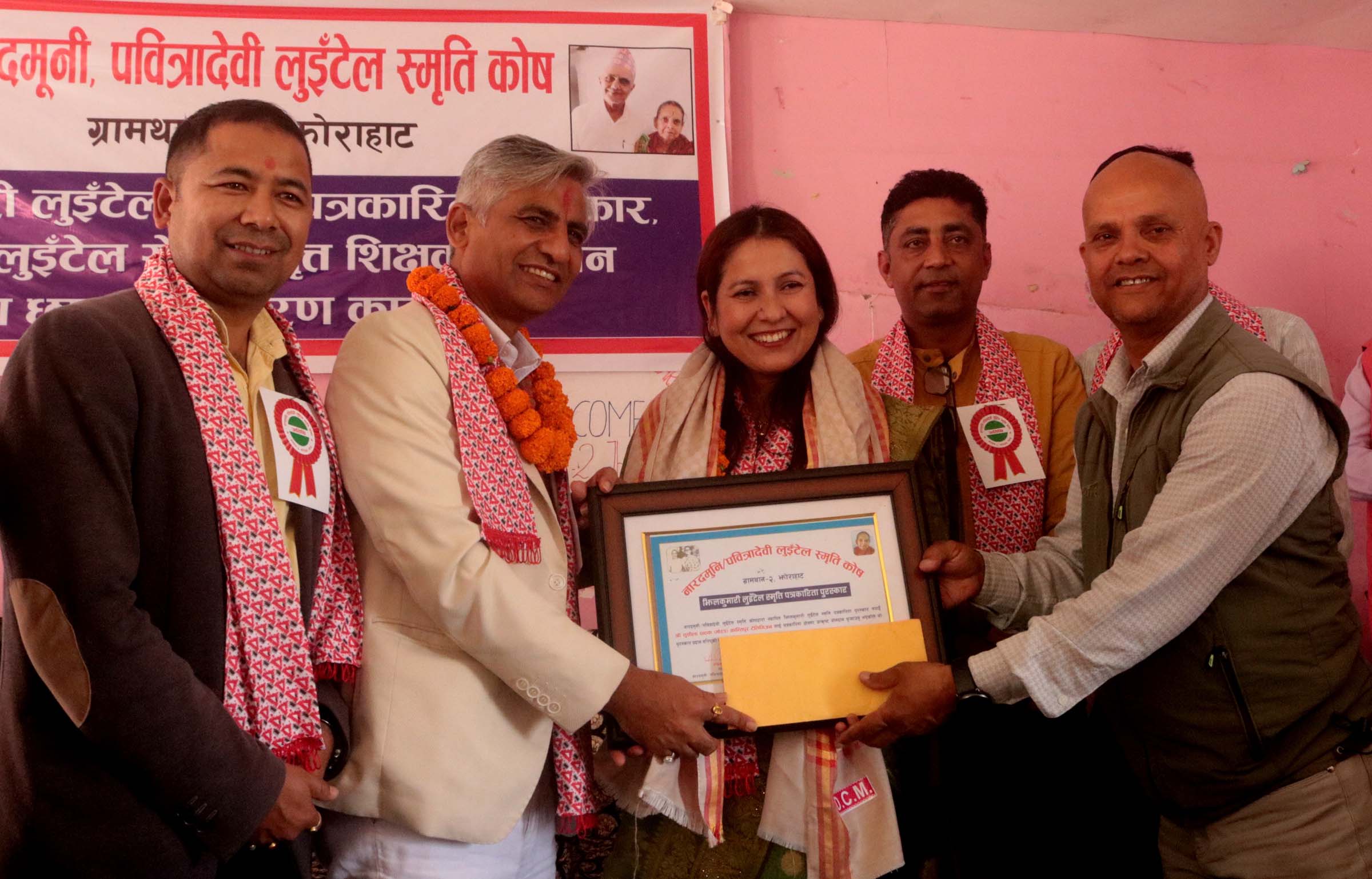 नारदमुनि– पवित्रा लुईटेल स्मृति कोष मोरब ग्रामथान गाउँपालिका–२ द्वारा शुक्रवार झोराहाटमा आयोजित । झिलकुमारी लुईटेल स्मृति पत्रकारिता पुरस्कारवाट सञ्चारकर्मी सुशिला पाठकलाई नगद सहित सम्मान गर्दै उहाँले अभिभावकले आफ्नो बावालिकालाई शिक्षाप्रति अभिप्रेरित गरेमा समाज र राष्ट्रको उन्नतिमा सहयोग पुग्ने धारणा राख्नु भयो । मुख्यमन्त्री कार्कीले अब्कको आधारमा विद्यार्थी उत्कृष्ट नहुने चर्चाै गर्दै कक्षा कोठा वाहिर चौर पनि रोजगार र शिक्षाको केन्द्र भएको उद्हारण खेलाडी कुसल भूर्तेल र दिपेन्द्र ऐरिले क्रिकेटको माध्यमबाट कायम गरेको विश्व किर्तिमानबाट देखिएको बताउनु भयो ।