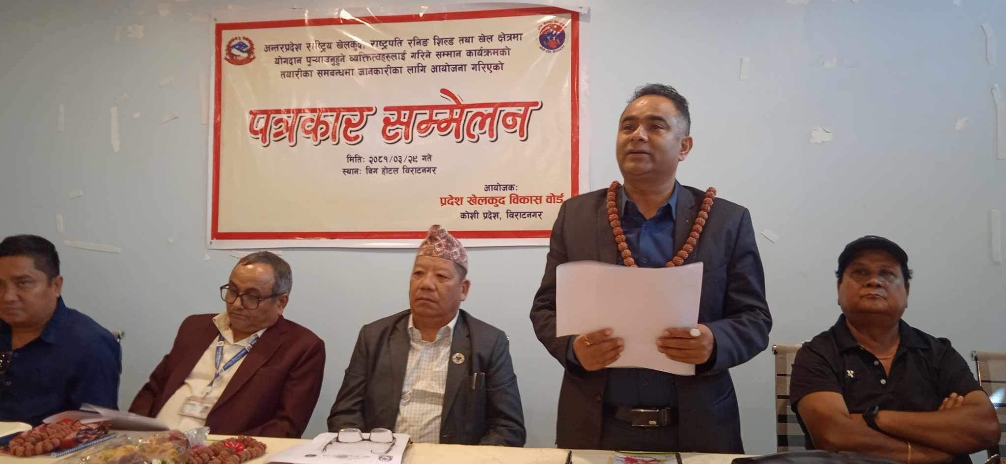 असार ३० गते आइतबार विराटनगरमा कार्यक्रम गर्दै खेलकुद विकास बोर्डले प्रतियोगितामा पदक विजेता खेलाडीहरूलाई सम्मान गर्ने भएको हो ।