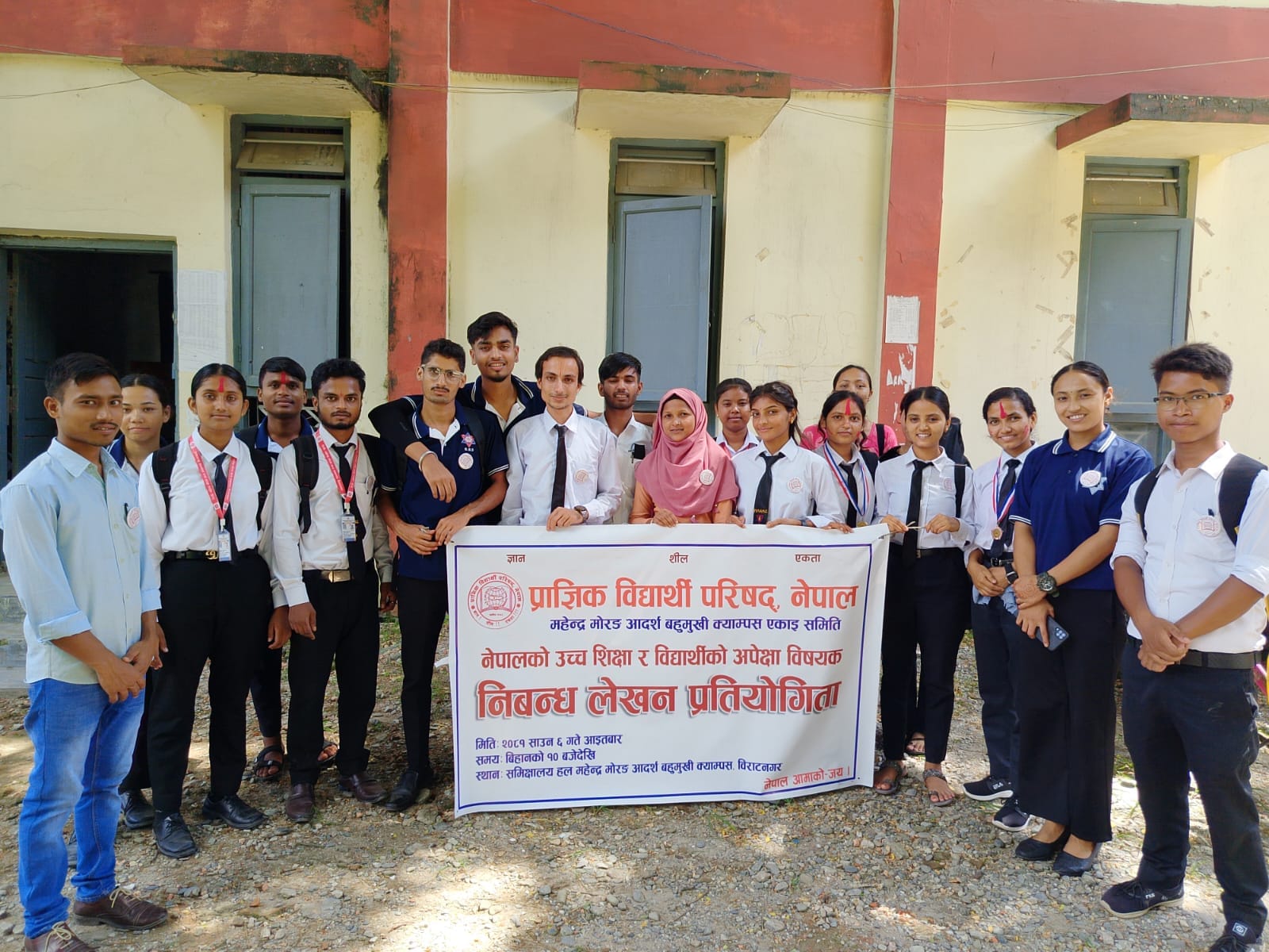 ‘नेपालको उच्च शिक्षा र विद्यार्थीको अपेक्षा’ विषयमा निबन्ध लेख्न लगाइएको थियो । कार्यक्रममा क्याम्पस एकाइ समिति संयोजक सरोज यादव, सगरमाथा प्रदेश सह–सचिव मुना बिष्ट, परिषद्का राष्ट्रिय सचिव तथा कोशी विभाग संगठन सचिव विवस कटुवाल लगायत विभिन्न संकायमा अध्ययनरत विद्यार्थीहरूको सहभागिता रहेको थियोे ।