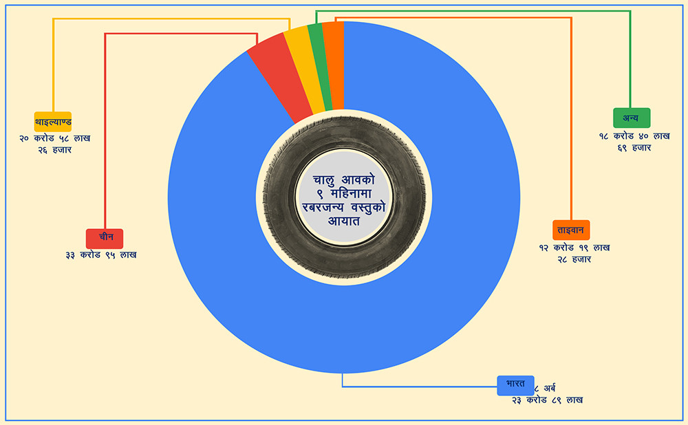 विभागको तथ्यांकानुसार नौ महिनामा सबैभन्दा बढी टायर र ट्युब भारतबाट आयात भएको देखिन्छ । विवरणानुसार चालु आवको चैत मसान्तसम्म भारतबाट मात्र ४४ लाख ४१ हजारभन्दा धेरै थान तथा १७ लाख ४८ हजार रबरजन्य वस्तु आयात भएको देखिन्छ । यसको आयात मूल्य आठ अर्ब २३ करोड ८९ लाख रुपैयाँभन्दा धेरै छ । आयातबाट सरकारले दुई अर्ब ८० करोड ६३ लाख रुपैयाँभन्दा बढी राजस्व उठाएको देखिन्छ ।
