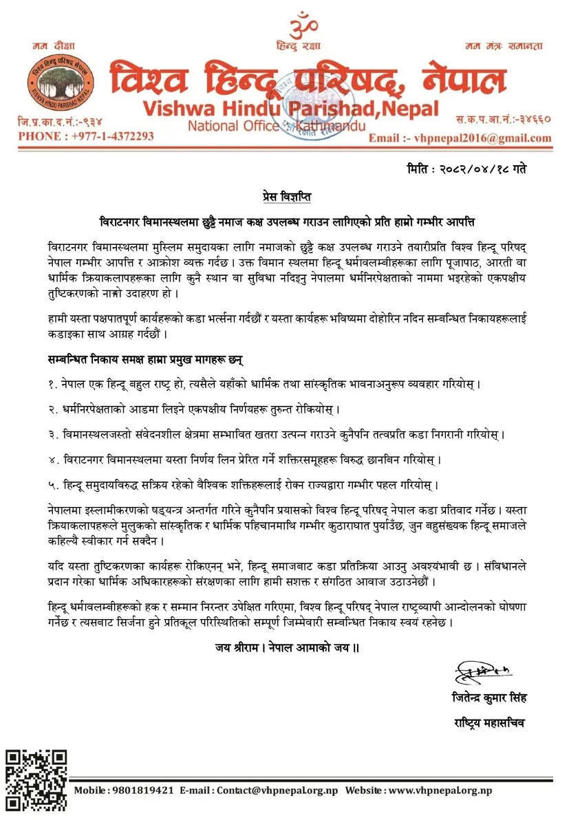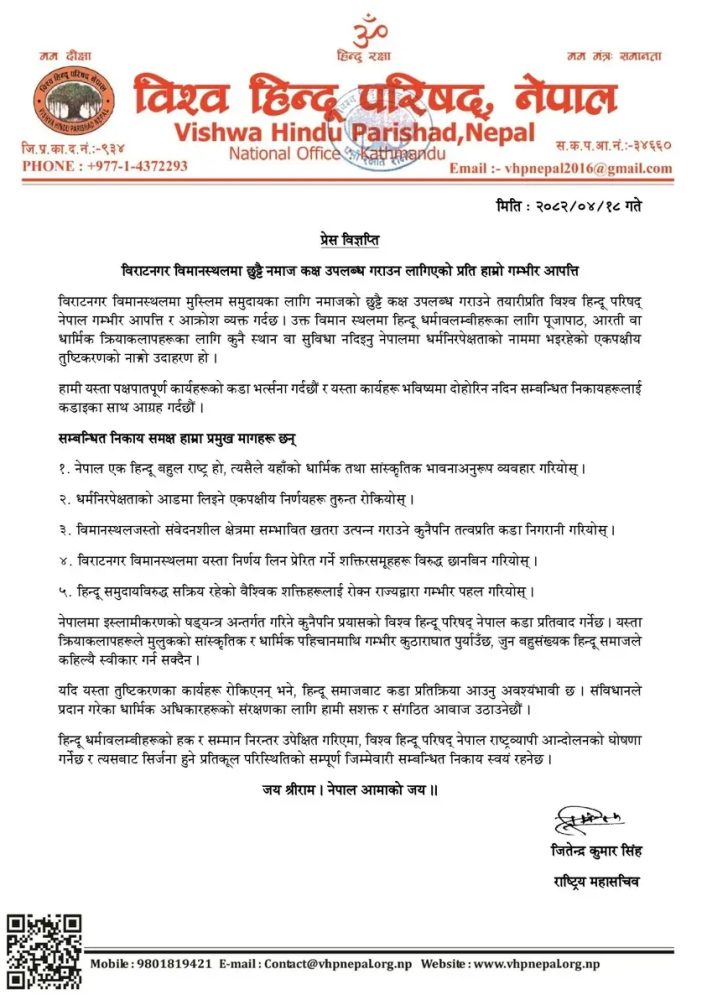 विराटनगर। विराटनगर विमानस्थलमा मुस्लिम यात्रुहरूको सुविधाका लागि छुट्टै नमाज कक्ष निर्माणको तयारी भइरहेका समाचारप्रति विश्व हिन्दू परिषद् नेपालले कडा आपत्ति जनाएको छ। परिषद्ले आइतबार विज्ञप्ति जारी गर्दै यस्तो निर्णय धर्मनिरपेक्षताको नाममा एकपक्षीय तुष्टिकरण भएको आरोप लगाएको हो।
