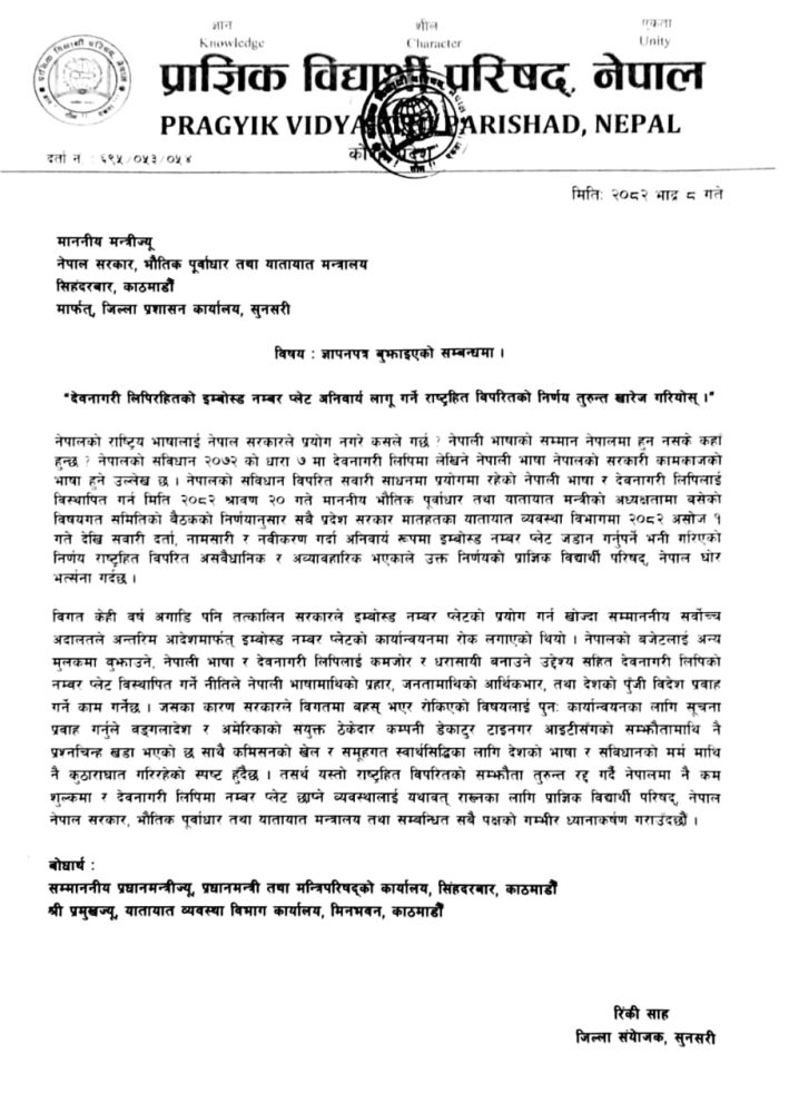 यातायात व्यवस्था विभागले श्रावण १ गते भित्र अनिवार्य रूपमा सबै सवारी साधनहरूमा अनिवार्य रूपमा अङ्ग्रेजी भाषाको रोमन लिपीमा लेखिएको इम्बोस्ड नम्बर प्लेट राखि सक्नु पर्ने र अन्यथा ट्राफिक प्रहरीले कारवाही गर्ने चेतावन दिएको निर्णयको विरोध गर्दै प्राज्ञिक विद्यार्थी परिषद्ले आज आईतवार सुनसरी सहित देभरका जिल्ला प्रमुख मार्फत ज्ञापन पत्र बुझाएको हो।